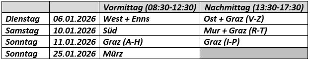 Nach Rückmeldung der Gebietsleiter ergibt sich für die verpflichtende Winterschulung im Jänner 2026 folgende Gebietseinteilung (beim Gebiet Graz bezieht sich der in Klammer angeführte Buchstabe auf den Familiennamen):