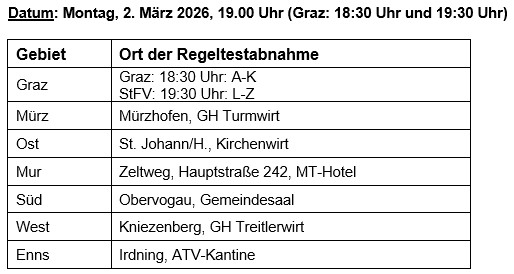 Der dezentrale Regeltest in den Gebieten findet am Montag, 2.3.2026 an folgenden Orten statt: